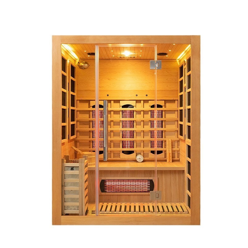 Инфрацрвена и парна сауна на дрва за 1-3 особе је препуна напредних функција за побољшање вашег веллнесс путовања: инфрацрвени грејачи и далеко - инфрацрвене грејне плоче од графена (обезбеђују равномерно, ефикасно грејање за дубоко, опуштајуће знојење); Јонизатор кисеоника (пречишћава ваздух у сауни, стварајући свежу и окрепљујућу атмосферу); Светло за читање и звучник (омогућава вам да читате или слушате музику док уживате у сауни); Контролна табла (омогућава лако подешавање температуре, времена и других подешавања за персонализовано искуство); Пећ за сауну и цев са светлосним таласом (заједно раде на стварању паре и инфрацрвене топлоте, служећи и љубитељима парне и инфрацрвене сауне).