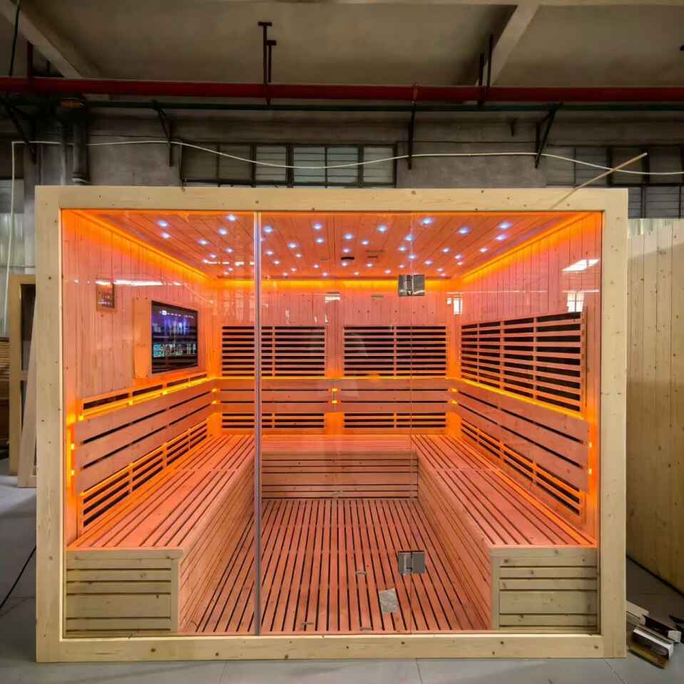 Хот Тагс: Дрвена сауна за 5-10 особа за сауну са далеком инфрацрвеном сауном са ЛЦД ТВ-ом, произвођачи, добављачи, велепродаја, фабрика, прилагођена, на залихама, Кина, попуст, цена, мода