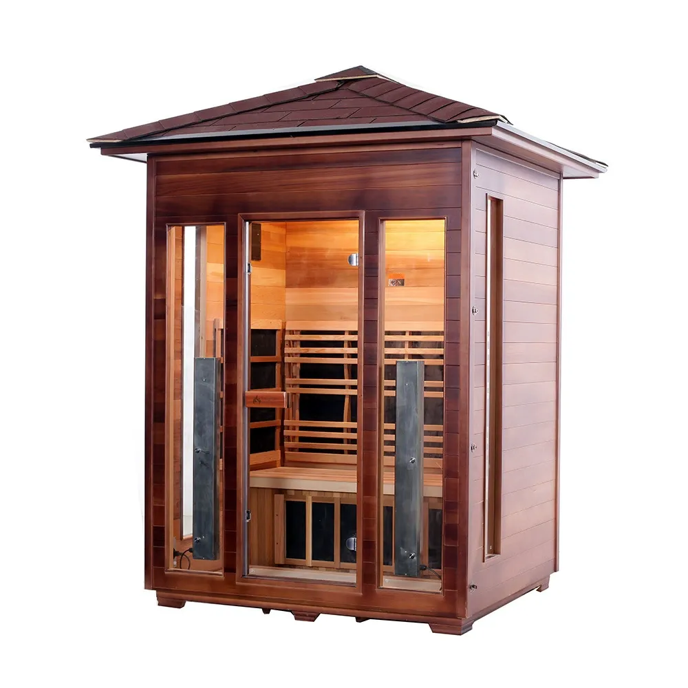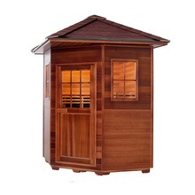 Ова вањска сауна је направљена од канадског западног црвеног кедра или канадске хемлоцк. Дрво се може похвалити отпорношћу на корозију и влагу, као и структурном стабилношћу. Опремљен са далеко инфрацрвеном технологијом грејања од угљеничних влакана, брзо се загрева и равномерно распоређује топлоту. Погодно за спољна окружења као што су дворишта, балкони, баште вила, области поред базена и одмаралишта.